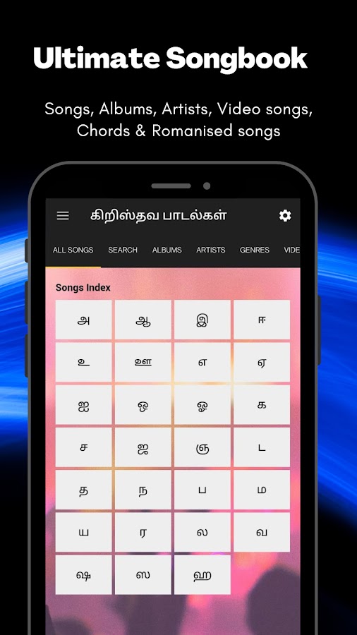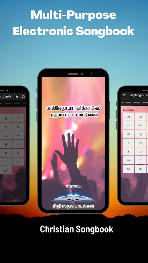 Приложение Kirusthuva Paadalgal (также известное как «தமிழ் கிறிஸ்தவ பாடல்கள்») представляет собой офлайн-электронную версию текстов тамильских христианских песен.