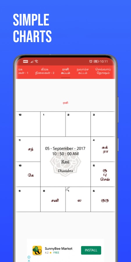 Гороскоп на тамильском языке предлагает легкий доступ к Jyothida kattangal, Raasi, navamsakam, предсказаниям бхавы, предсказаниям Dasa, йогам, Jathaga porutham и многому другому. Он идеально подходит для тех, кто хочет проанализировать свой Джатхагам. Гороскоп на тамильском языке приложение предоставляет Джотида паланкал посредством комплексного анализа джатхагама и мгновенно генерирует граханилай или карту рождения в предпочтительном стиле астрологической карты.
