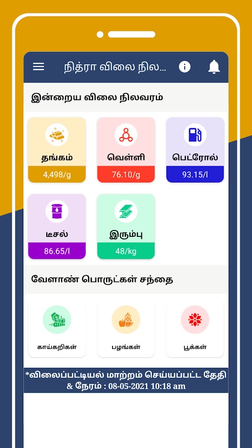 🍅 Это приложение по ценам на овощи на тамильском языке помогает узнать о ежедневных рыночных ставках на овощи, цветы, фрукты, бобовые и крупы, а также о типах масел, ставках на золото, серебро и железо, ставках на бензин и дизельное топливо.