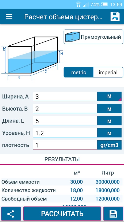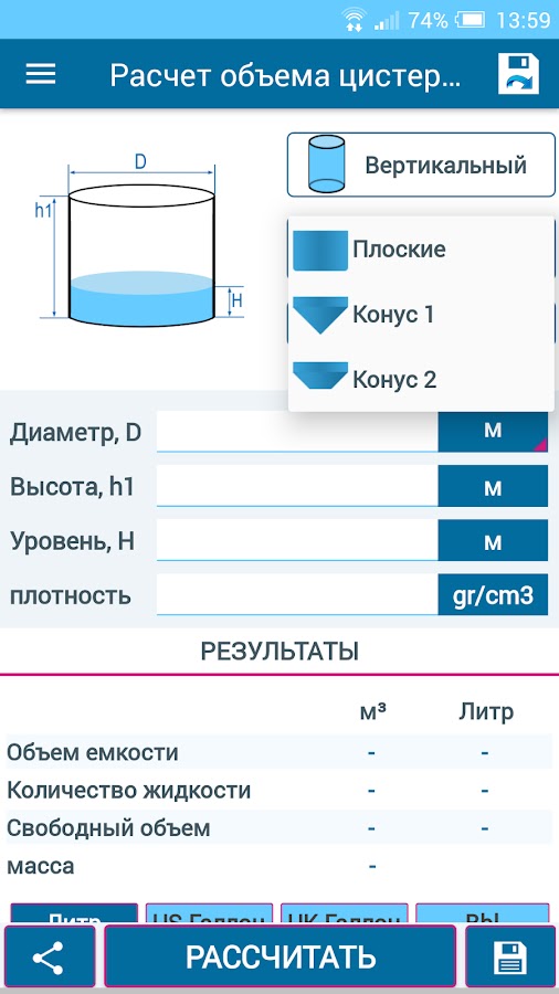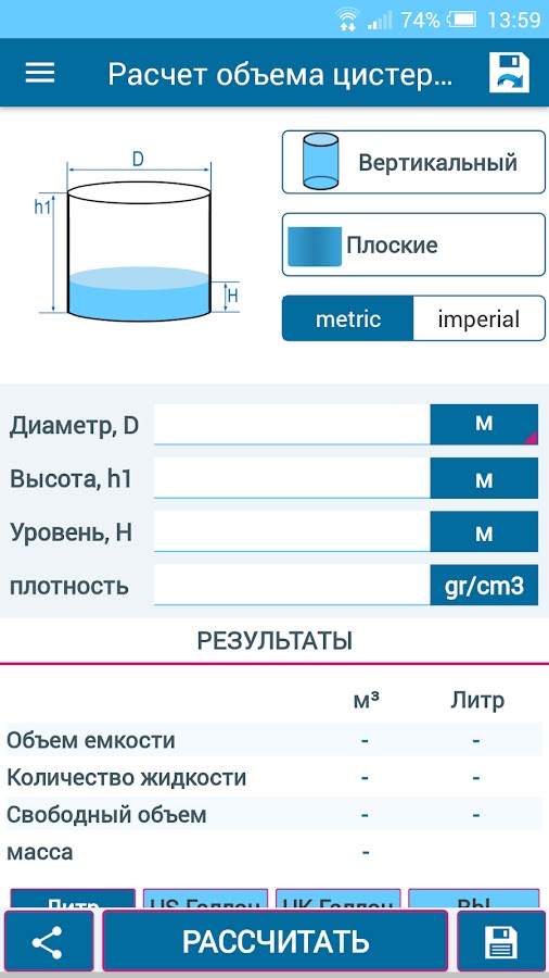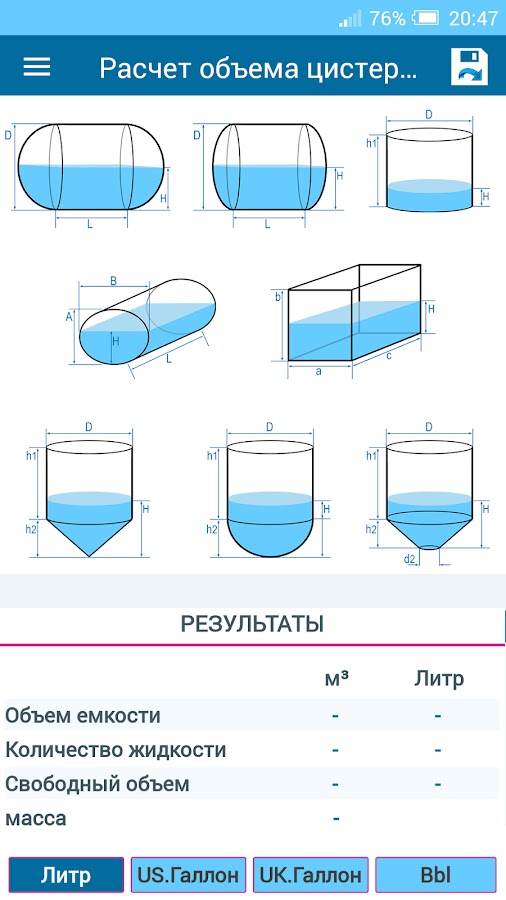 Калькулятор объема бака — это быстрое и простое приложение для расчета объема резервуаров. Или вы можете рассчитать объем жидкости в резервуаре или резервуаре.