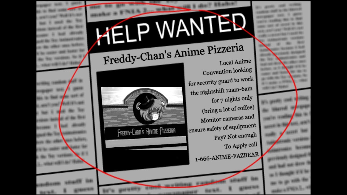 Добро пожаловать в пиццерию Freddy-Chan’s Anime Pizzeria!!! Место, где оживают фантазия и веселье (и аниматроники). Познакомьтесь с бандой аниматроников в главных ролях: Фредди, Бонни, Чика, Фокси, Мангл, BB и Марионетка. Поверьте мне, вам они понравятся. Приводите семью и друзей на лучшее время в вашей жизни!!!