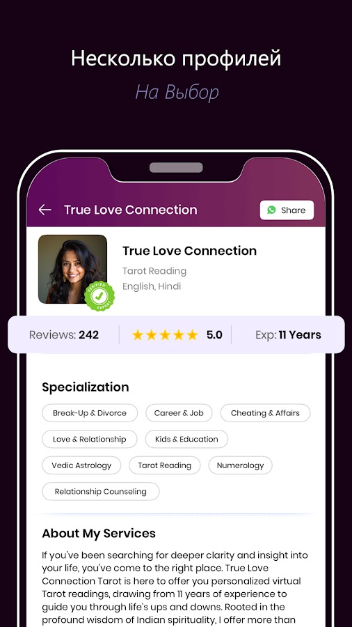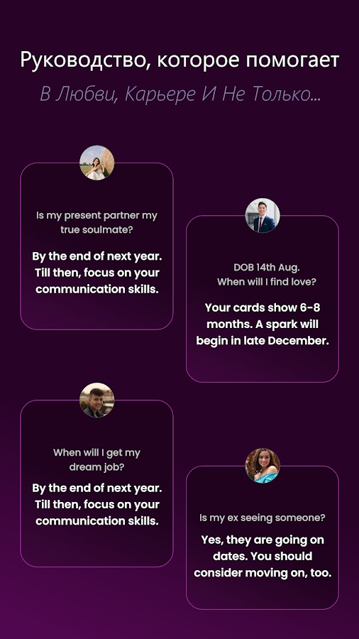 В приложении собраны проверенные и опытные таро-читатели, экстрасенсы и астрологи со всего мира, готовые дать точные и значимые прогнозы.