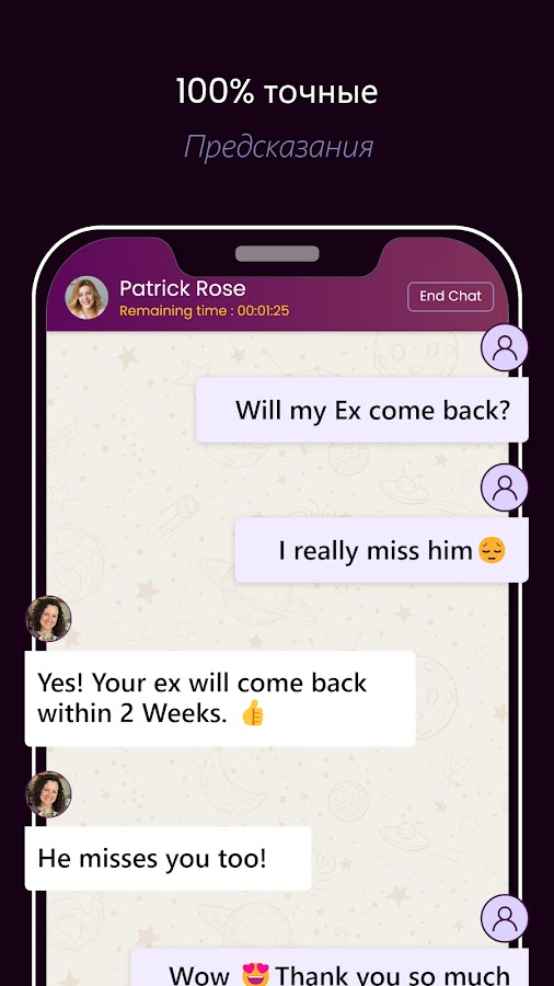 Общайтесь в чате или звоните 24/7, чтобы получать рекомендации о любви, карьере, финансах и будущем.