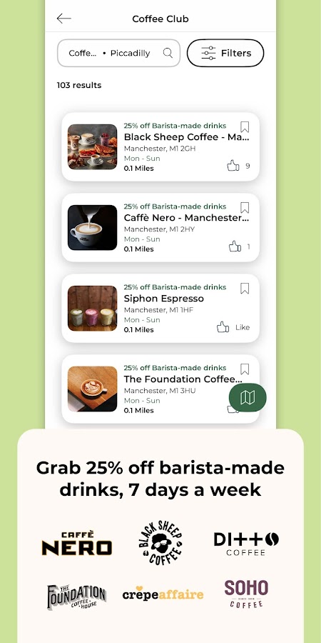 — 25% скидка на напитки, приготовленные бариста, в Caffè Nero и в 1000 других кофейнях, 7 дней в неделю