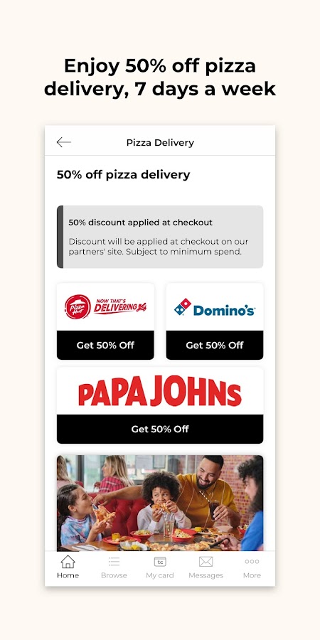 Получайте скидки на вкусные блюда в тысячах ресторанов и точек доставки пиццы, а также экономьте на билетах в кино, достопримечательностях и многом другом с картой вкуса.