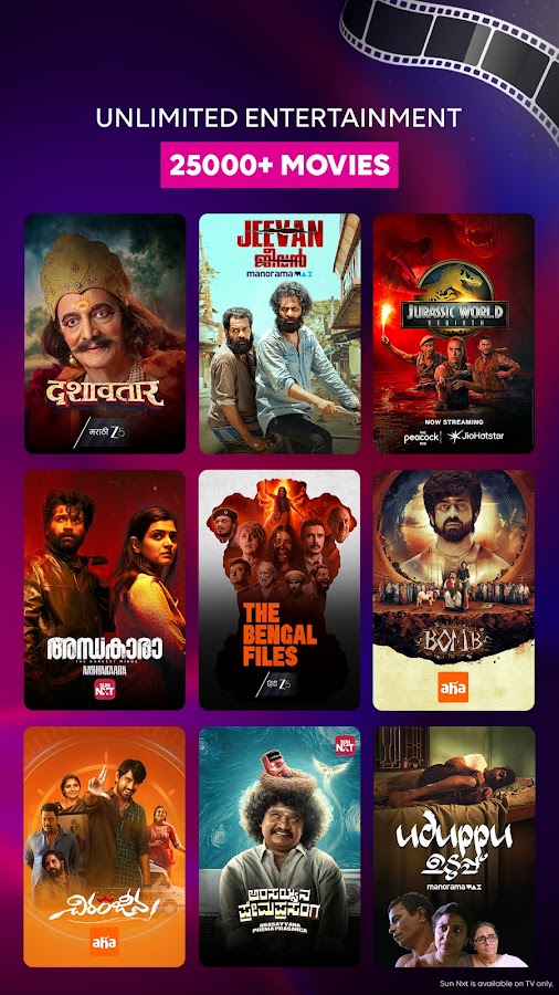 • Практически безграничный выбор контента: более 20 000 фильмов, более 8000 веб-шоу, а также прямые трансляции спортивных событий, телешоу и документальные фильмы из более чем 30 OTT-приложений. Получите несколько приложений в одной подписке, пакеты начинаются всего от 149 рупий.