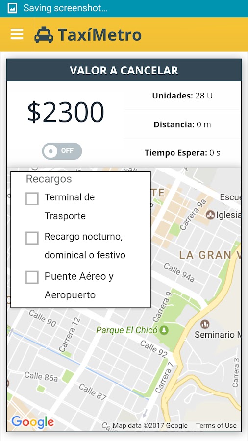 Не позволяйте таксисты взимать больше, Metered GPS Боготе можно проверить точное значение единиц, вы можете отслеживать с помощью GPS телефона, проверьте расстояние и время ожидания, стоимость и единицы вашей карьера.