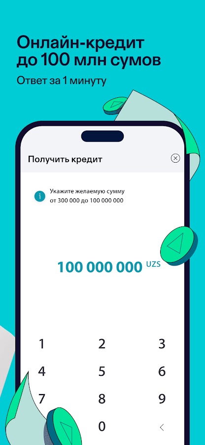 💵 Онлайн-кредит до 100 млн сумов. Оформление прямо в приложении, без поручителей, залога и лишних документов. Начислим деньги сразу на вашу виртуальную карту Humo от TBC Bank. Перед тем как взять кредит, можно рассчитать ежемесячные платежи по одобренной ставке в кредитном калькуляторе прямо в приложении.