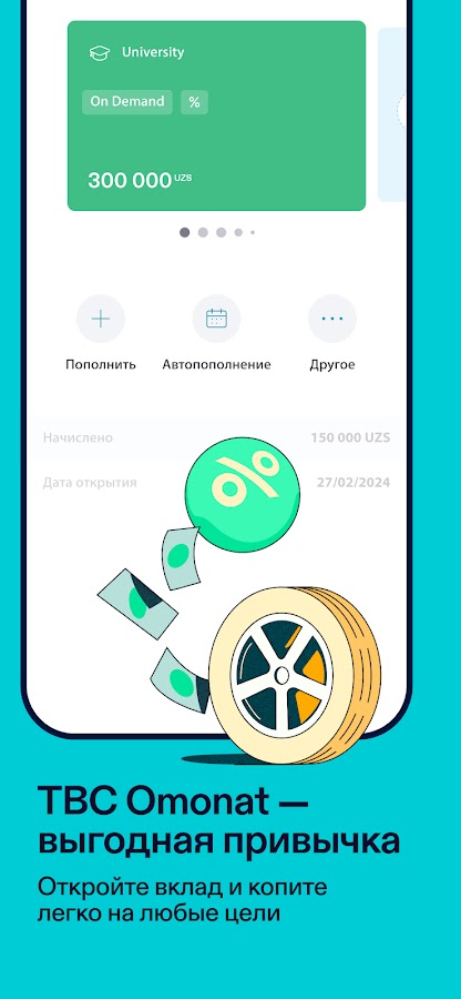 💰 Онлайн-вклады сроком до 24 месяцев. Начисляем проценты по вкладу каждый день, а выплачиваем их раз в месяц. Пополнить вклад можно в приложении TBC UZ с любой привязанной карты. Вклады TBC Bank застрахованы государственным фондом, поэтому ваши деньги всегда будут в безопасности.