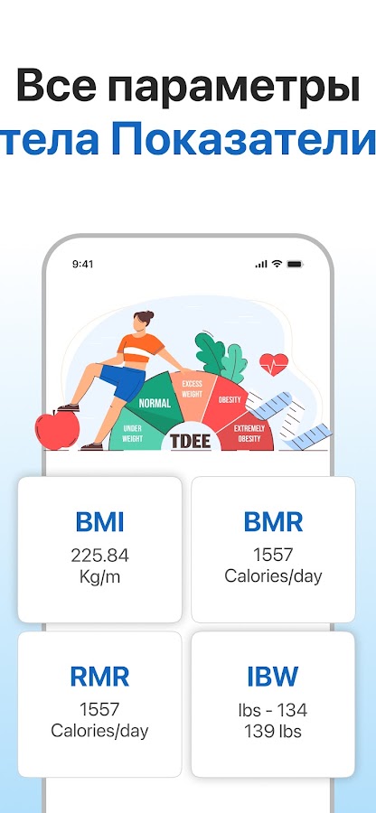 Это приложение отличается чистым и простым в использовании интерфейсом и предоставляет точные расчеты калорий, включая значения TDEE, BMR, RMR, BMI, IBW, FBM и LBM.