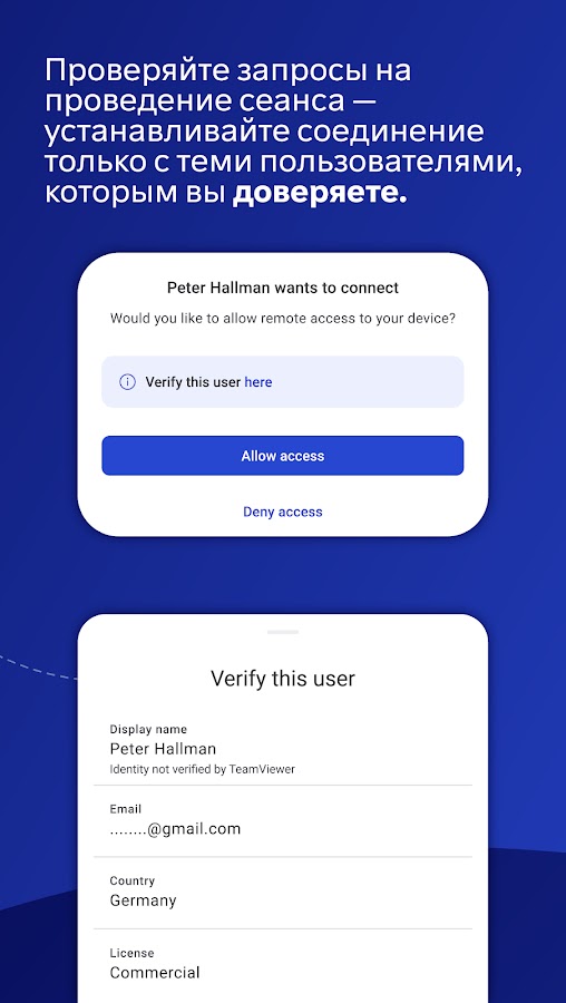 Устанавливайте соединение только с теми пользователями, которым вы доверяете. Приложение предоставит вам подробные сведения о пользователе, такие как имя, адрес электронной почты, страна и тип лицензии, чтобы вы могли подтвердить личность пользователя, прежде чем разрешить ему доступ к вашему устройству.