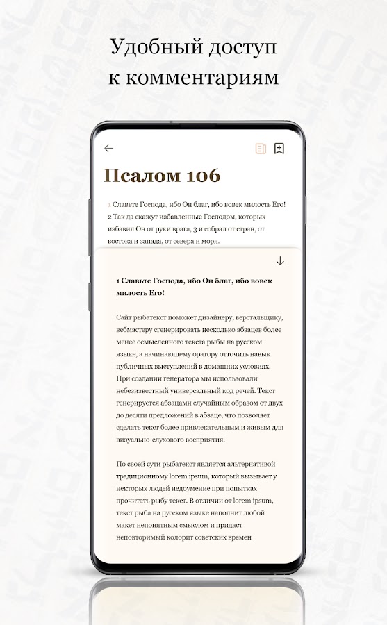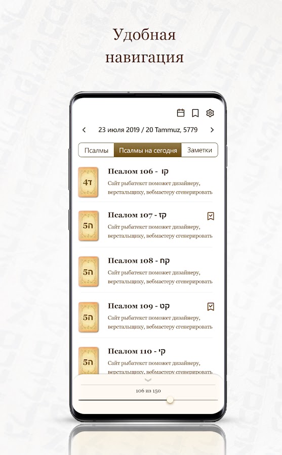 Вы можете сделать подборку любимых псалмов с помощью закладок и добавить свои заметки к любому псалму.