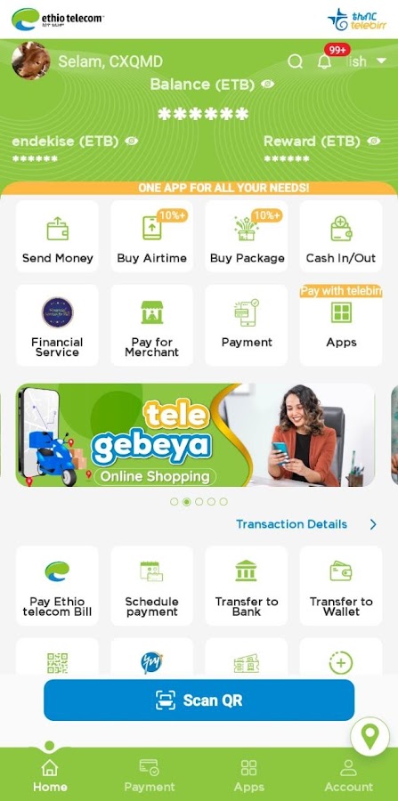 Ethio telecom telebirr SuperApp — это универсальное мобильное приложение, которое позволяет вам получать доступ к широкому спектру услуг в одном приложении. Приложение позволяет вам получать услуги, которые вам нужны в повседневной деятельности, такие как проведение транзакций Telebirr, покупка телекоммуникационных продуктов, платежи электронной коммерции, покупка товаров и услуг, цифровые финансовые услуги, оплата государственных услуг, оплата топлива, оплата кафе и ресторанов. , билеты и транспортные услуги, развлечения, коммерческая и коммунальная оплата и многое другое.