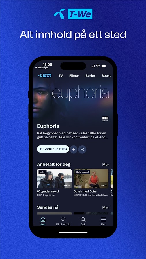 Вы просто входите в систему, вводя номер своего мобильного телефона, который зарегистрирован на Моих страницах по адресу telenor.no, чтобы получить доступ к приложению T-We. Здесь вы также можете дать доступ нескольким пользователям в семье. Из-за ограничений прав некоторые программы и телеканалы можно просматривать только тогда, когда вы находитесь дома. Ассортимент каналов, фильмов и сериалов зависит от вашей подписки.