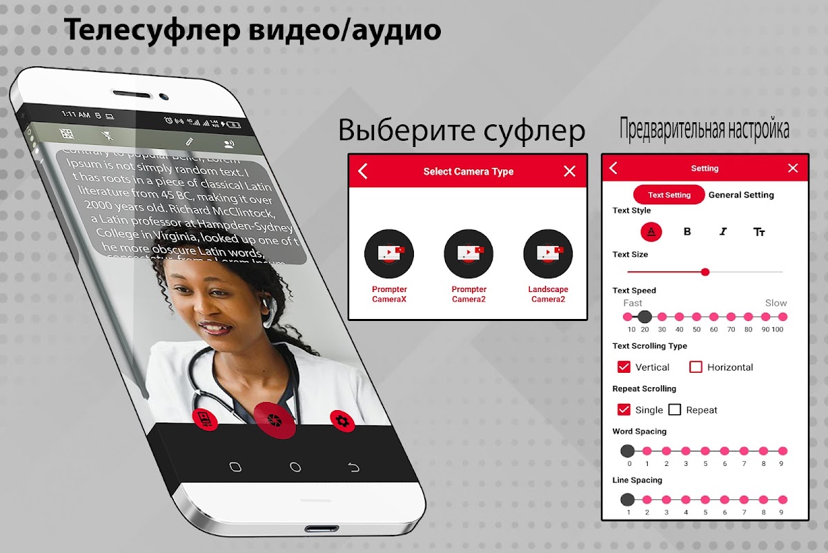 с приложением камеры телесуфлера вы можете легко читать свой сценарий и в то же время легко записывать видео или аудио сценария. Приложение видеотелесуфлера обеспечивает лучший вариант для захвата сценария видеоклипа. Приложение камеры телесуфлера для Android предоставляет обе функции для создания видео или аудиоклипа с голосовым сценарием. зеркало телесуфлера показывает сценарий перед экраном камеры, чтобы человек мог легко говорить и записывать видеоклип. С помощью приложения телесуфлера вы можете легко объяснить свой контент аудитории, а не делать заметки и другим сотрудникам. Вы можете легко настроить видеотелесуфлер под свои нужды, цвет шрифта, скорость перемещения сценария и другие параметры.