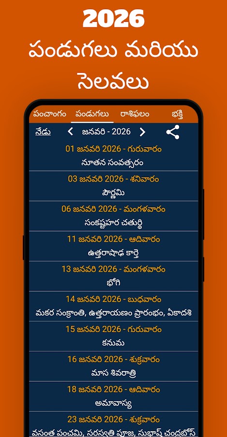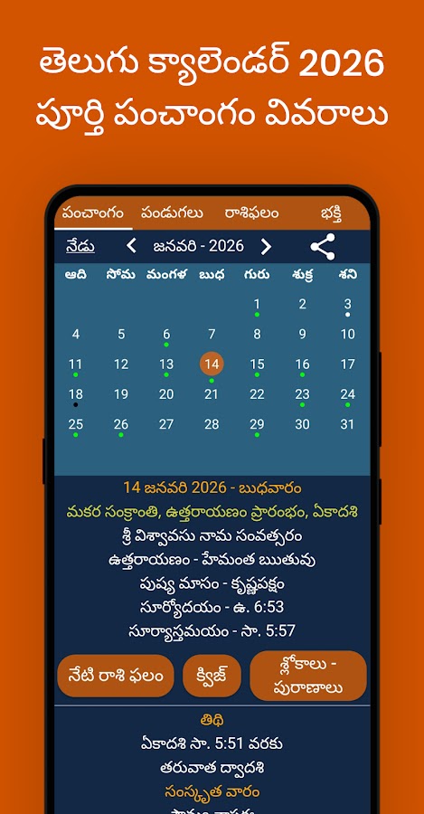 Скачайте наше приложение Telugu Calendar 2026 прямо сейчас и будьте в курсе панчангам, фестивалей, ежедневных/еженедельных/годовых гороскопов/информации о телугу джатакам, статей о бхакти, мифологических историй, шлок Бхагавад-гиты, стотр и аштоттрам прямо на ходу.