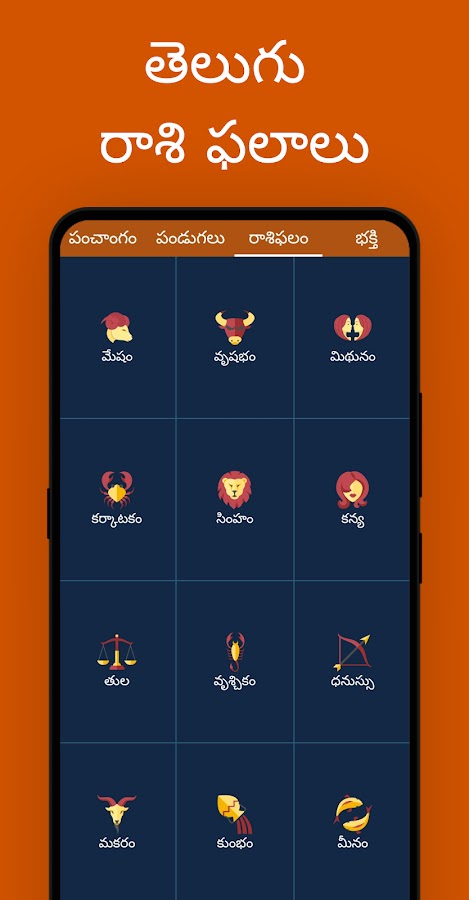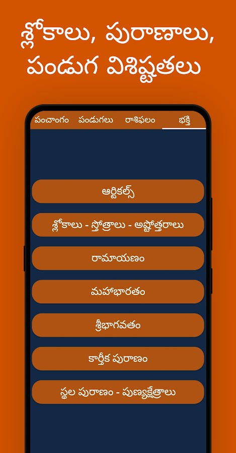 3) Перемещайтесь между вкладками «Панчангам», «Фестивали», «Раши-пхалалу» и «Бхакти», чтобы просмотреть подробные результаты панчангама, список праздников, информацию о гороскопе на телугу или духовные статьи.