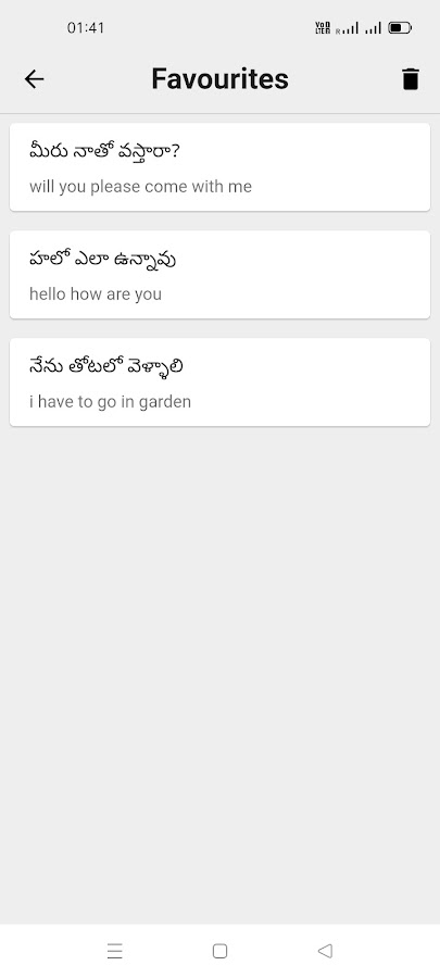 Это приложение показывает предыдущие переводы в разделе истории приложения. Он также имеет любимый раздел для хранения ваших любимых переводов.