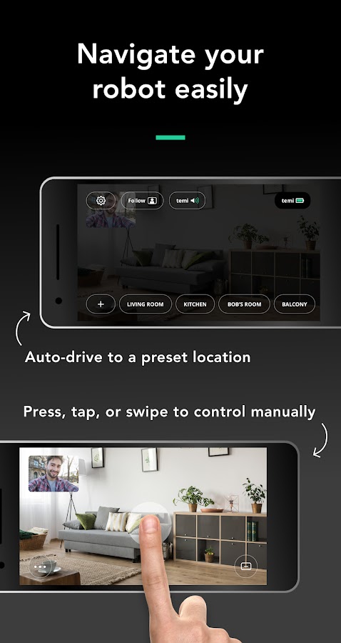 Загрузите приложение temi, чтобы активировать и насладиться всеми возможностями своего личного робота — temi, или общаться в видеочате, как никогда раньше, с помощью робота temi друга, путешествуя по дому. Будь где угодно!