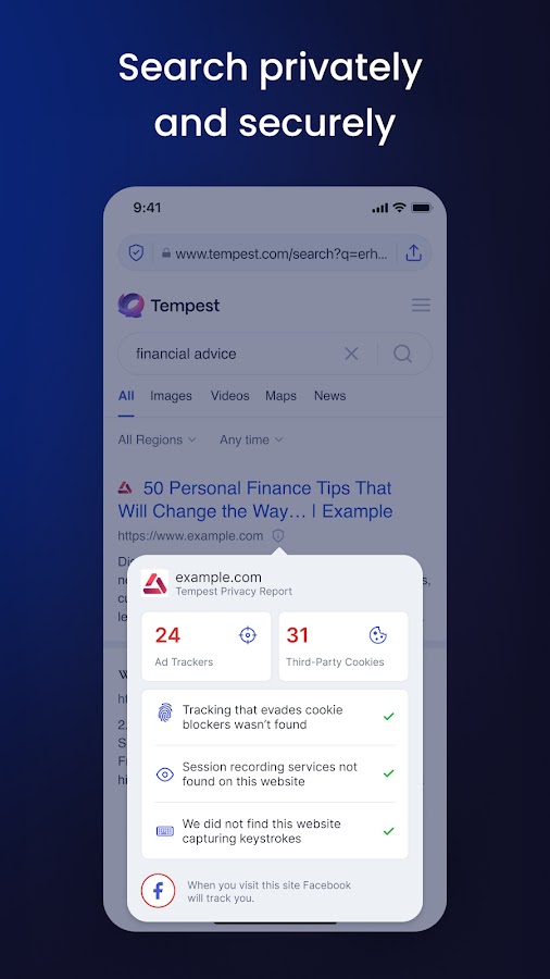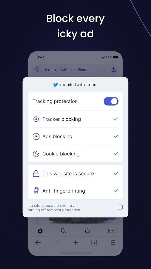 Tempest — это быстрый, безопасный и приватный браузер, который позволяет вам контролировать свои личные данные в Интернете. С Tempest вас не отслеживают, не профилируют, не снимают отпечатки пальцев и не преследуют целевую рекламу, когда вы перемещаетесь по Интернету.