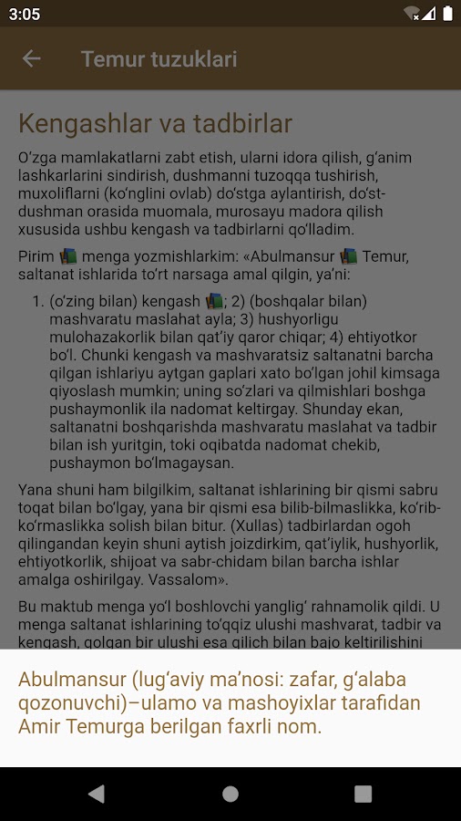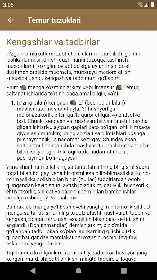Скачайте приложение Temur tuzuklari для Android бесплатно - последняя версия (2.1.5) уже доступна для установки на ваш телефон или планшет.