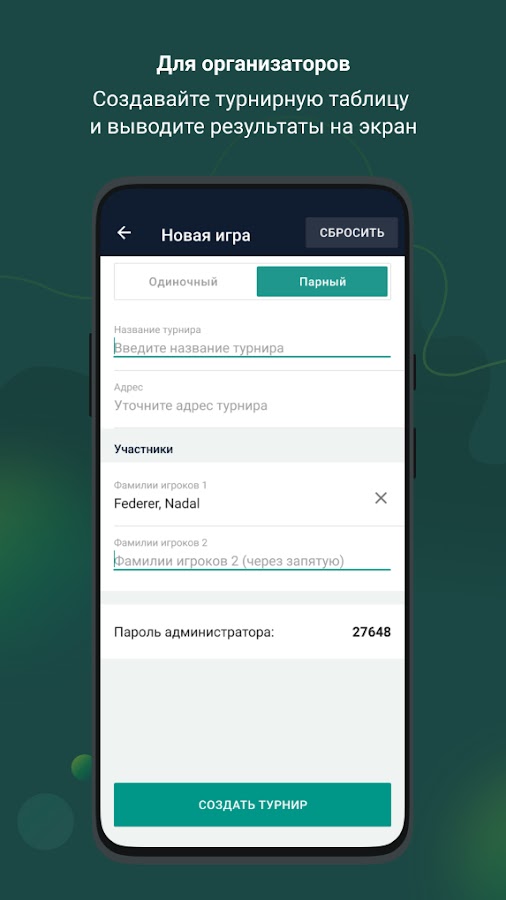 Создавая турнир, организатор или судья придумывает пароль, открывающий доступ для записи спортсмена на конкретный матч. Игроки, не знающие пароль, не смогут присоединиться к соревнованию. Так, организация теннисного турнира превращается в четко отлаженный процесс.