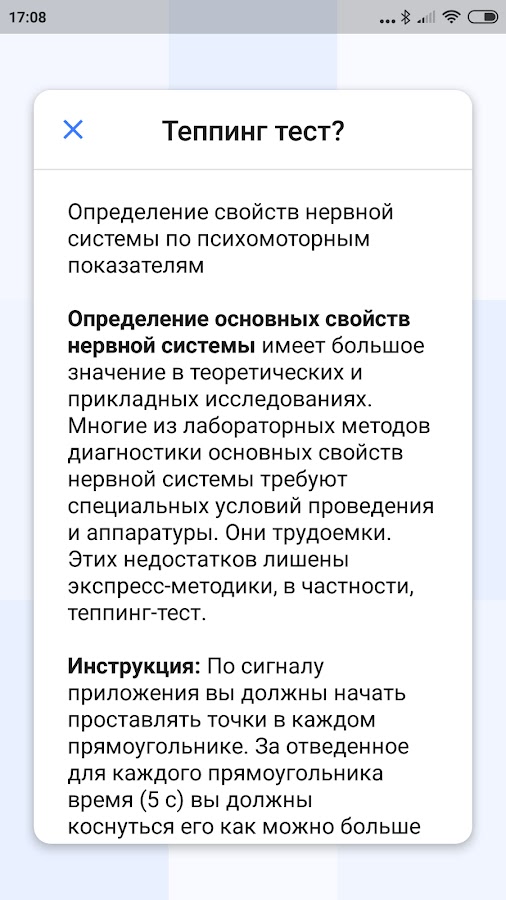 Определение основных свойств нервной системы имеет большое значение в теоретических и прикладных исследованиях. Многие из лабораторных методов диагностики основных свойств нервной системы требуют специальных условий проведения и аппаратуры. Они трудоемки. Этих недостатков лишены экспресс-методики, в частности, теппинг-тест.