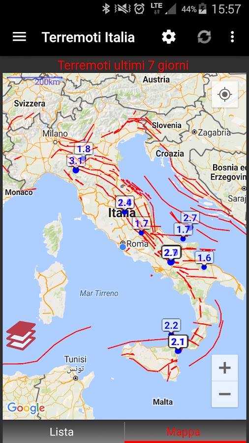 Будьте в курсе последних землетрясений в Италии и просматривать их на карте вдоль активных разломов и карты сейсмической опасности итальянской.