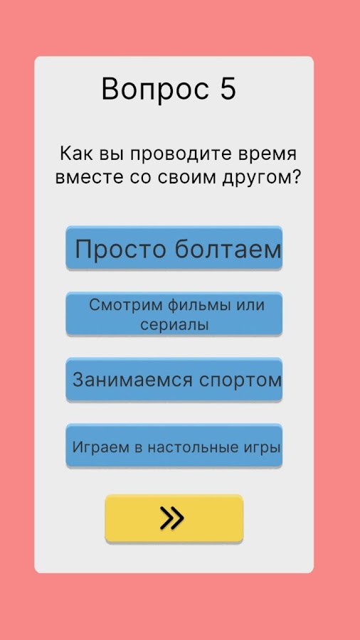 Весёлые вопросы и задания — приложение наполнено разнообразными тестами, которые помогут вам узнать друг друга лучше!