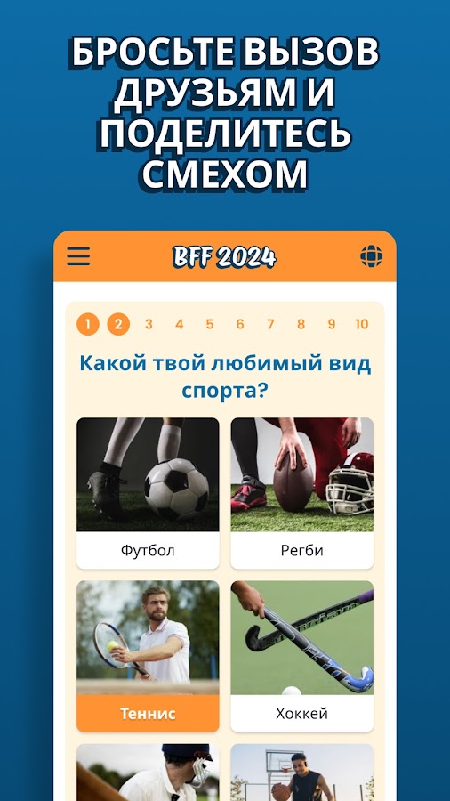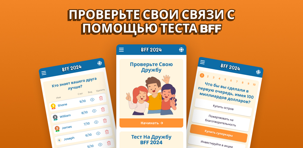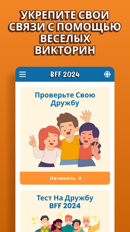 🏆Ваш тест на дружбу начинается с момента создания вашей викторины. Вы получите от 15 до 25 вопросов на викторину, охватывающих различные категории, от еды до путешествий. Ваши друзья будут пытаться ответить на все вопросы правильно, чтобы доказать свою связь. В конце BFF викторины вы сможете увидеть, кто из друзей набрал лучший результат и, следовательно, знает вас лучше всех. Все так просто!🤩 Так чего же вы ждете?🏆