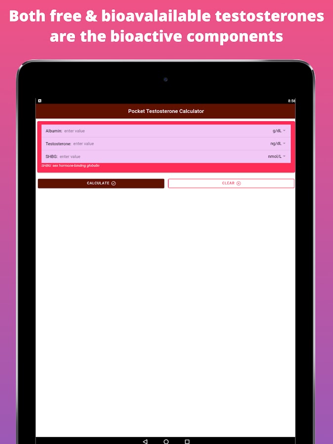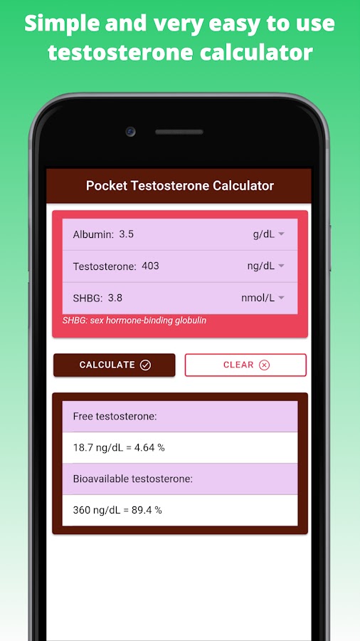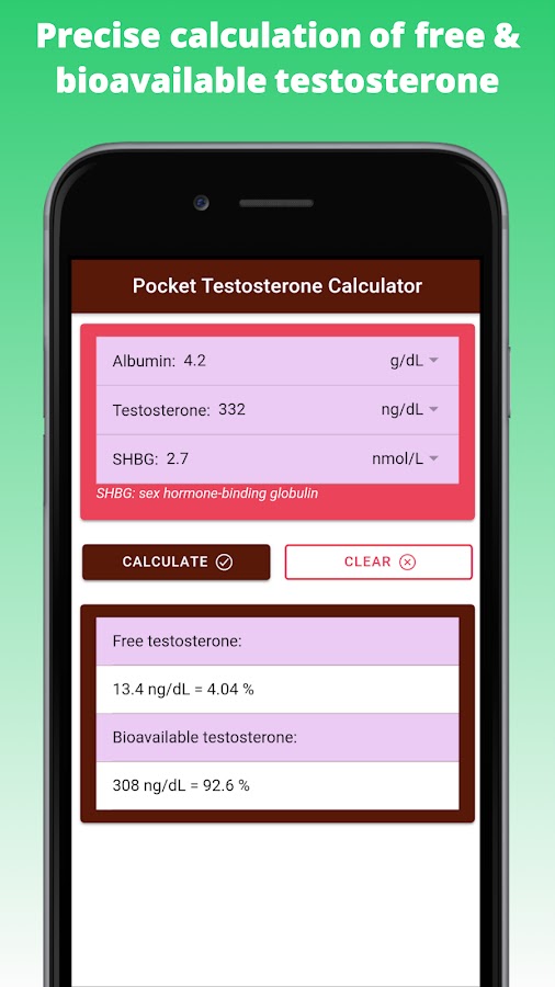 «Калькулятор тестостерона Pro — Mens Health» — это мобильное приложение, предназначенное для того, чтобы помочь практикующим врачам рассчитать уровень свободного и биодоступного тестостерона. И свободный, и биодоступный тестостерон более точно отражают уровень биоактивного тестостерона, чем единственное измерение общего сывороточного тестостерона. Фракция, связанная с глобулином, связывающим половые гормоны (SHBG), является биологически неактивной из-за высокой аффинности связывания SHBG с тестостероном. Свободный тестостерон измеряет свободную фракцию. Биодоступный тестостерон включает свободный тестостерон, который слабо связан с альбумином.