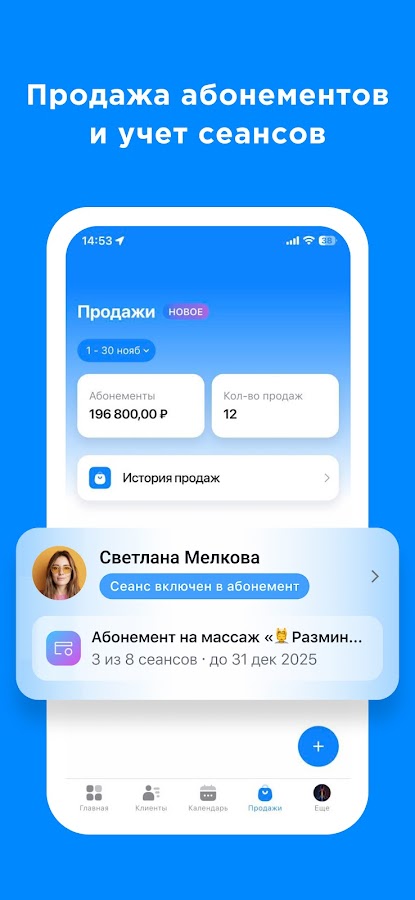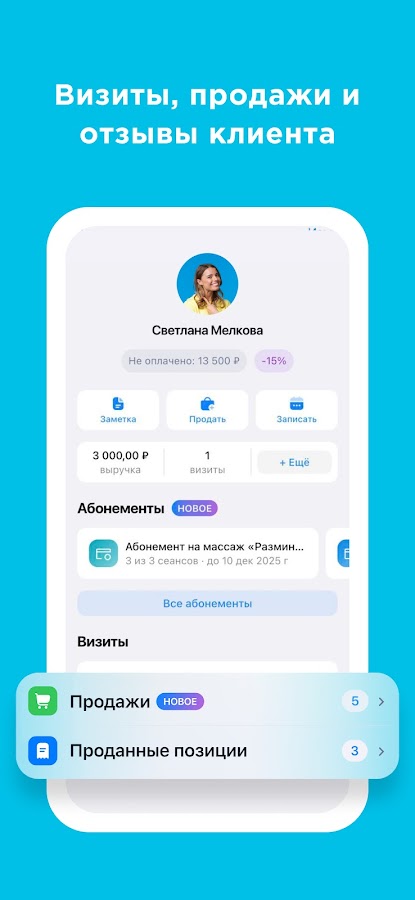 Просматривайте предстоящие и прошедшие записи, личную информацию о клиенте. Находите клиентов рядом с собой. Узнайте, какую выручку приносит клиент, его средний чек.