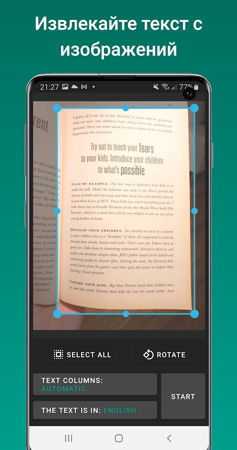 • Автоматически очищает изображение, подправляет перспективу и выравнивает строки