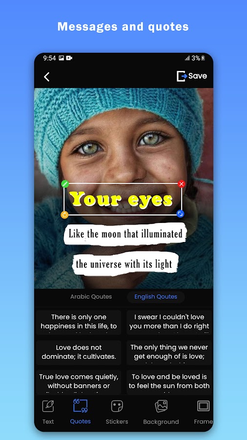 • Программа-конструктор содержит большую коллекцию арабских цитат помимо английских цитат, готовые предложения и фразы, написанные красивыми шрифтами, которые можно добавлять к изображениям одним щелчком мыши.
