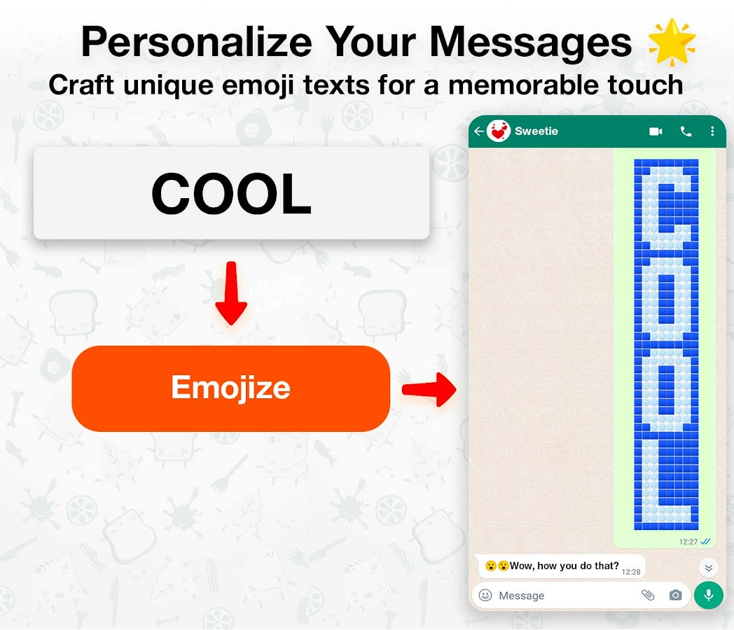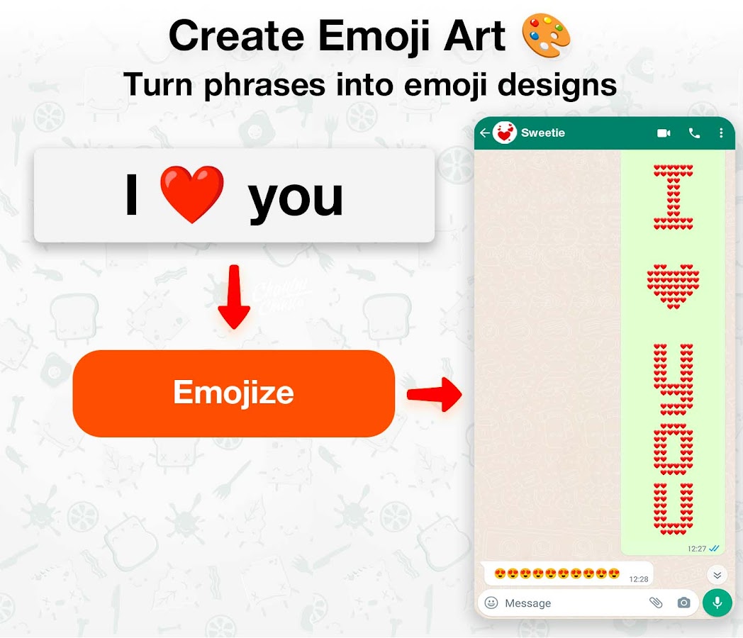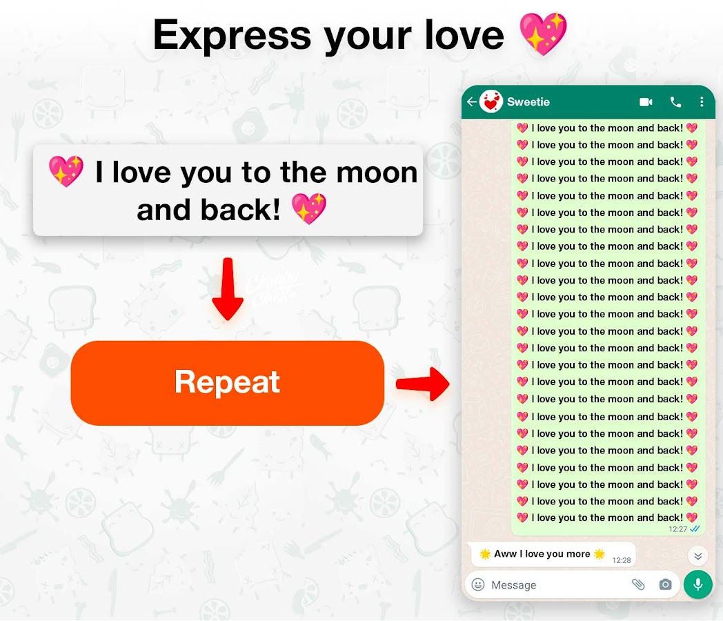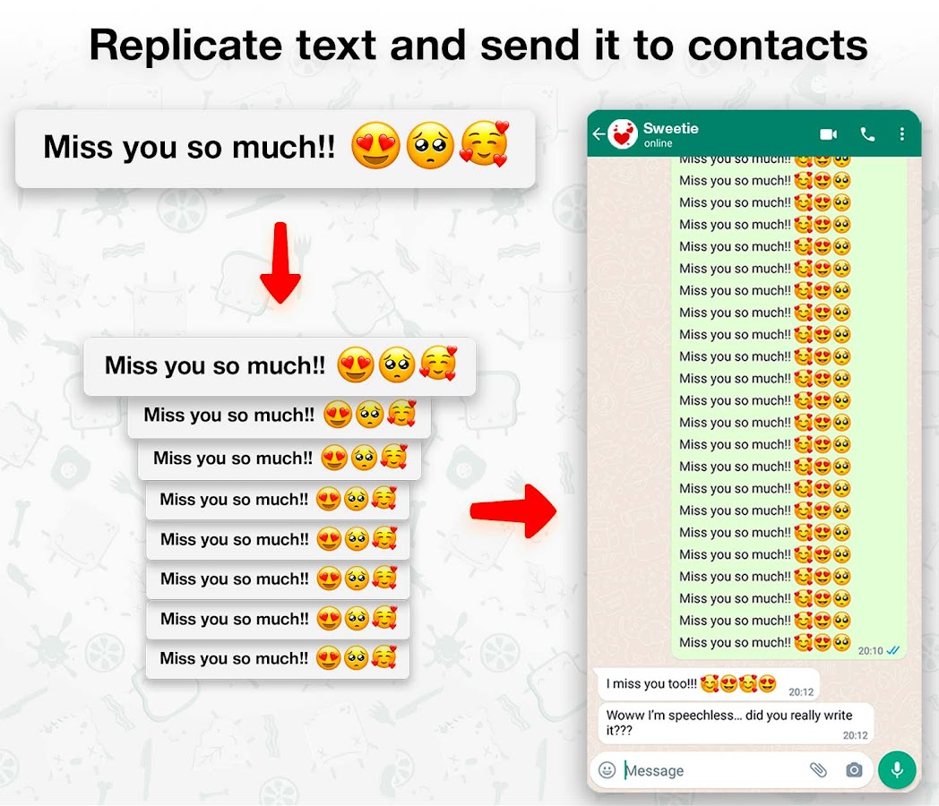 Улучшите качество обмена сообщениями с помощью лучшего приложения для репликации текста — идеального решения для создания сообщений, привлекающих внимание. Этот инструмент повторения текста создан, чтобы впечатлять: он позволяет вам повторять слова сотни раз и придавать тексту оригинальность. Создавайте запоминающиеся текстовые фразы-эмодзи, которые привлекут внимание ваших друзей и сделают ваши сообщения незабываемыми.