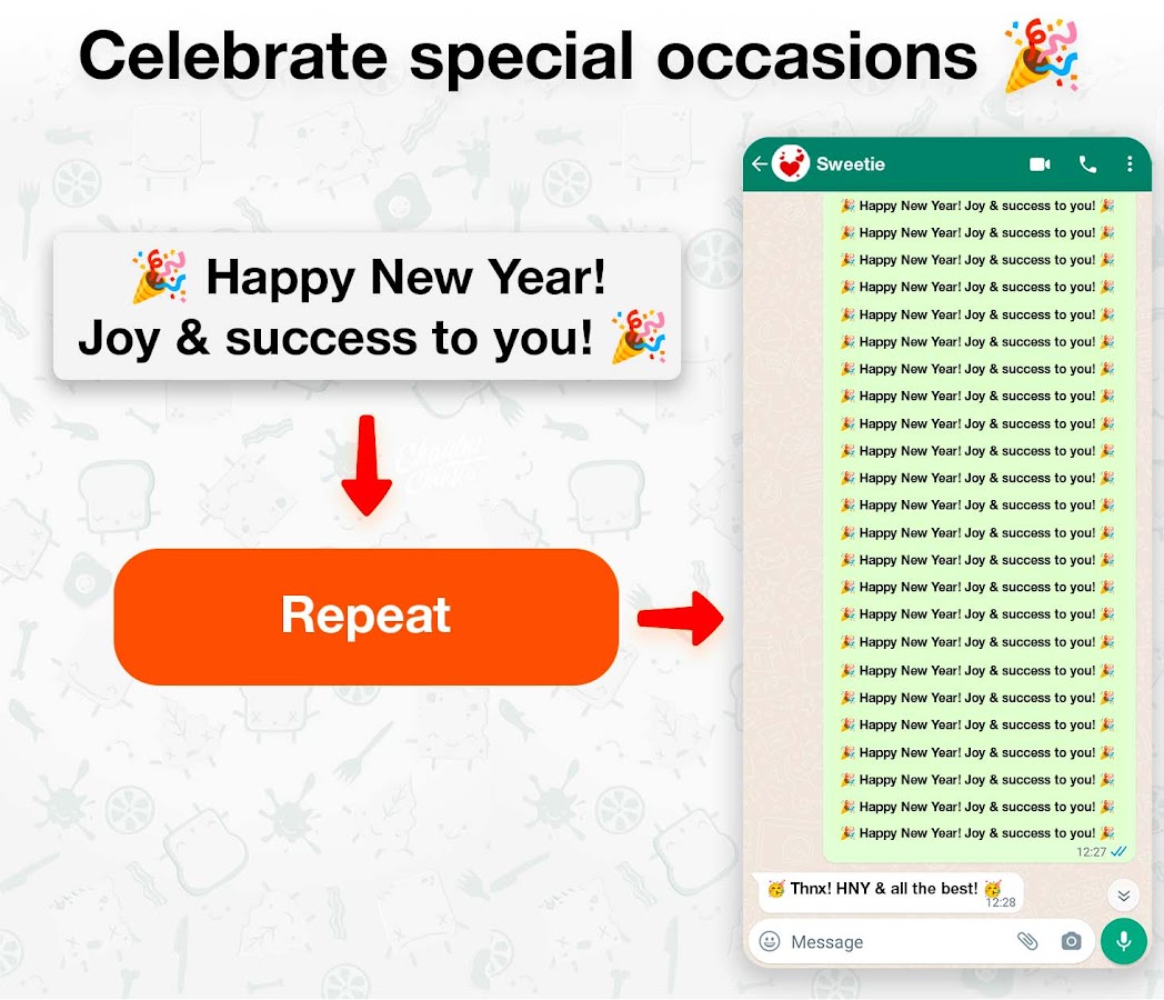 Наше приложение позволяет транслировать ваше сообщение несколько раз одним щелчком мыши. Выбирайте популярные предложения из предопределенного списка, копируйте их и с легкостью отправляйте своим контактам. Используйте возможности смайлов и различные варианты форматирования, чтобы создавать запоминающиеся и приятные сообщения.