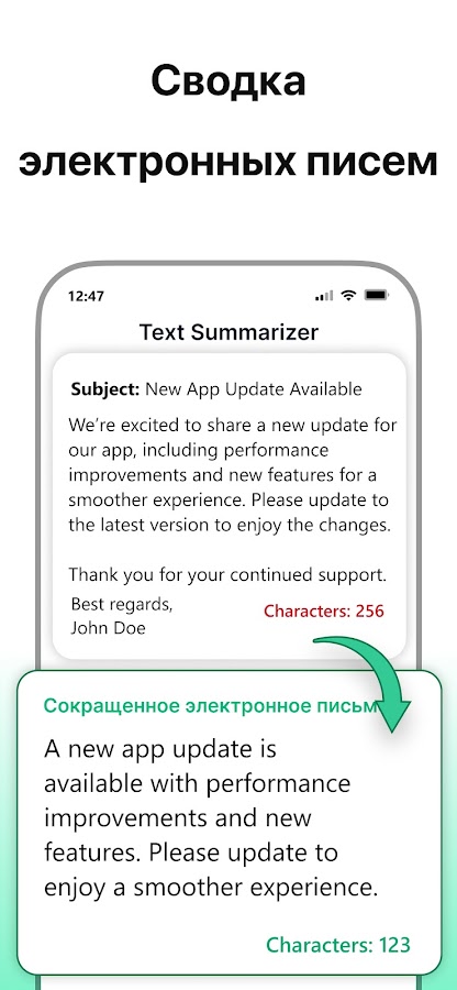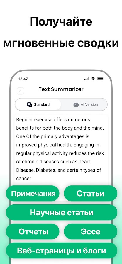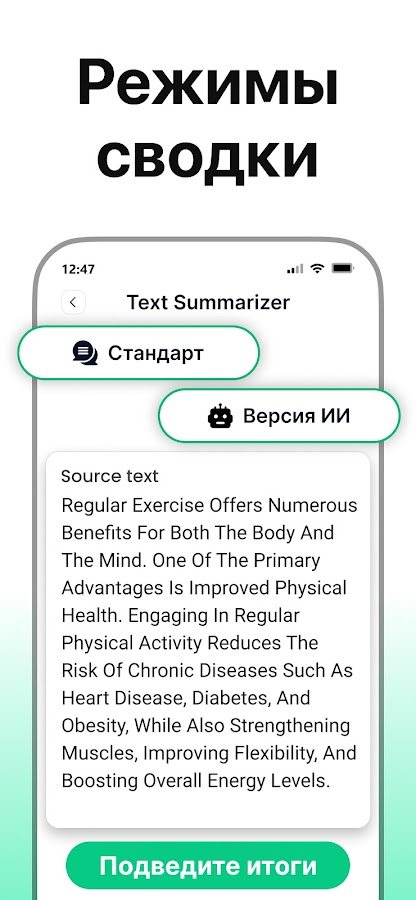 Преобразуйте длинный текст в краткое резюме одним касанием. Идеально подходит для быстрого чтения и быстрого понимания.