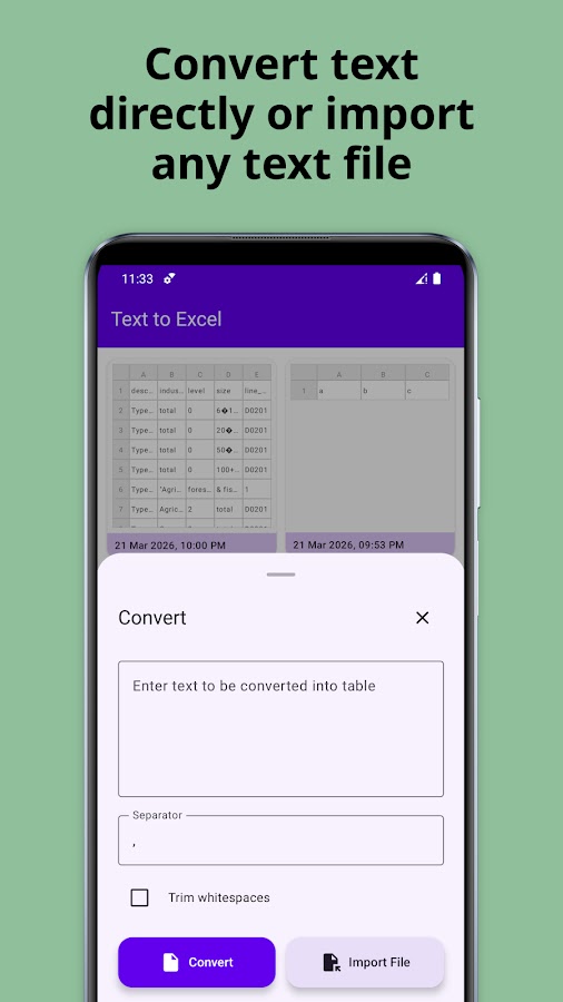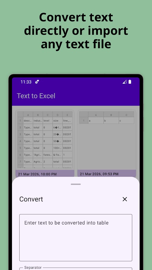 Приложение «Конвертер текста в таблицы» избавляет от хлопот по управлению данными. Одним касанием вы можете преобразовать любой тип текста. Больше никакого ручного ввода или утомительного форматирования — только мгновенный результат.