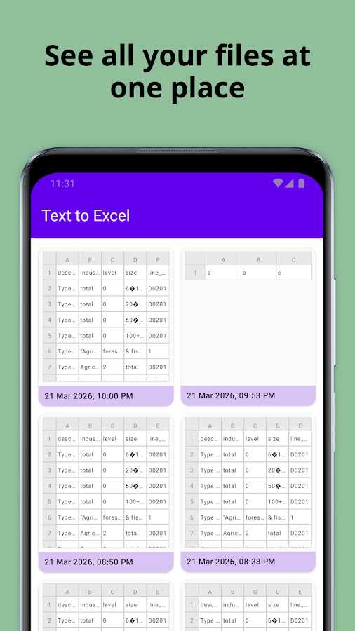 Доступ к преобразованным файлам очень прост. Приложение включает встроенный файловый менеджер, который позволяет легко организовывать, просматривать и обмениваться файлами Excel. Держите свои данные в порядке и всегда под рукой.