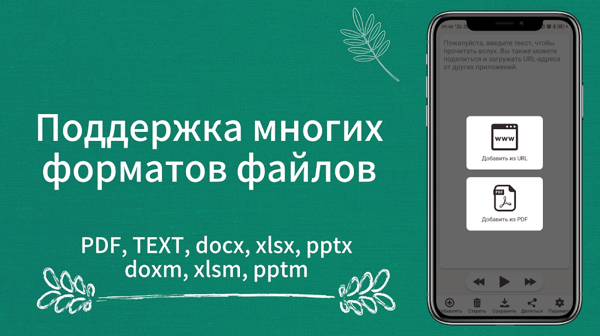 Текст можно читать из файлов PDF, TEXT, docx, xlsx, pptx, docm, xlsm и pptm.