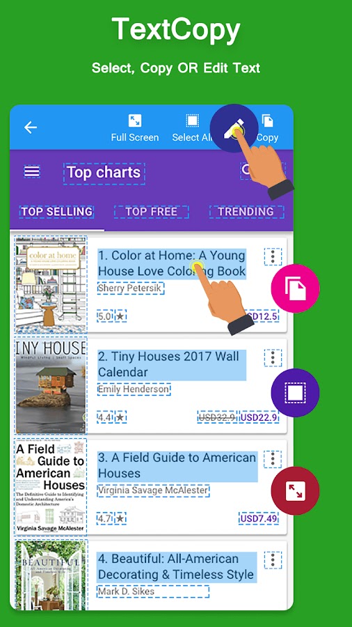 • Плавающая кнопка помогает легко начать копирование текста в любом приложении.