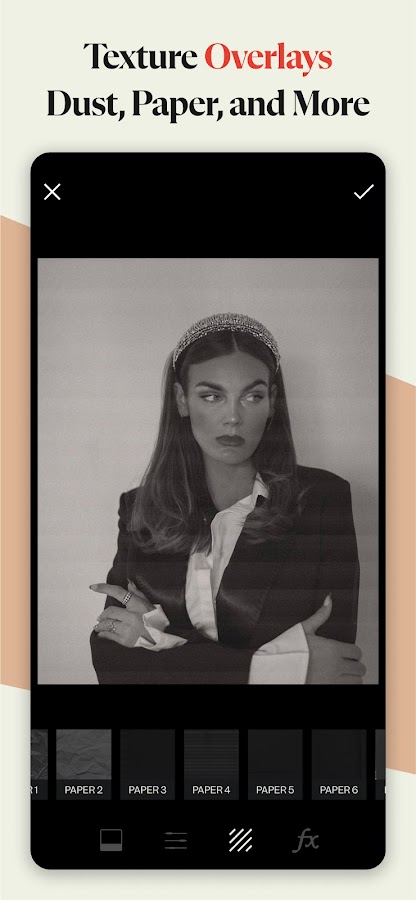 Добавьте текстуру и объем своим фотографиям с помощью таких наложений, как «Бумага», «Пыль», «Свет», «Пластик», «Тени» и т. д.