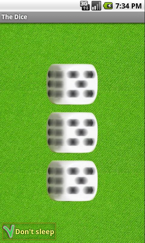 Вы любите настольные игры? Но часто теряете игральные кубики? Это приложение поможет вам! Теперь чтобы играть в настольные игры вам не обязательно снова искать ваши игральные кости, просто запустите приложение и выберите вариант с одним, двумя или тремя игральными кубиками. Нажмите на экран чтобы «бросить игральные кости». Если вас раздражает что телефон постоянно пытается уснуть и заблокироваться, отметьте галкой «Не спать» и телефон не уснет.