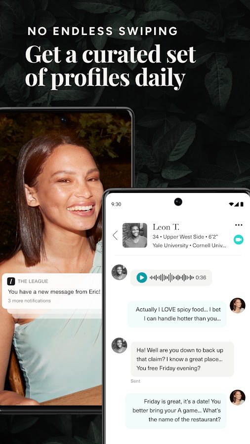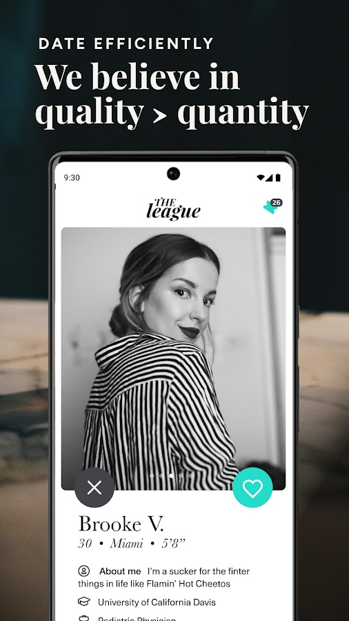 Лига — это приложение для выборочных знакомств, предлагающее своим участникам каждый день тщательно подобранную «группу» потенциальных клиентов, а не неограниченный поток профилей. Созданная для мотивированных свиданий, которые предпочитают быть одинокими, а не смириться, The League твердо убеждена, что 3 качественных матча лучше, чем 100 плохих. Лига рассматривает заявки, чтобы обеспечить активное сообщество людей с единомышленниками и реальной мотивацией для поиска значимых долгосрочных отношений.