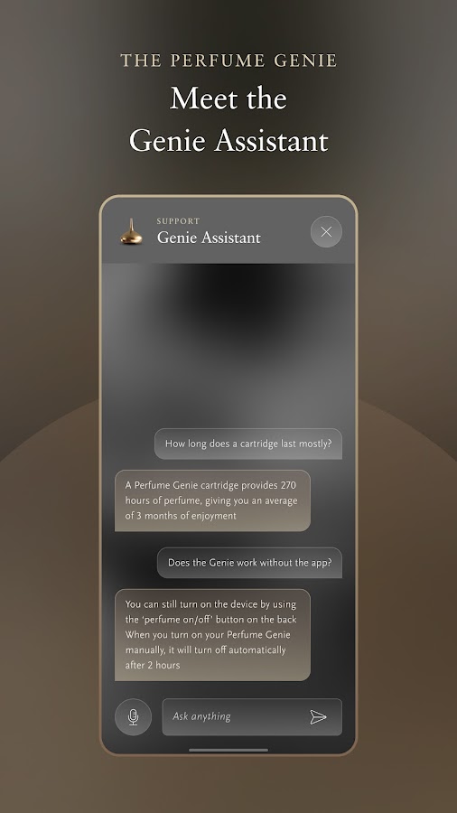 • Genie Assistant — доступен круглосуточно и без выходных, чтобы ответить на все ваши вопросы, связанные с Perfume Genie.