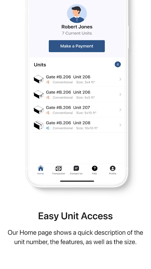Мобильное приложение Storage App предоставляет пользователям простой и удобный доступ ко всем вещам, хранящимся в собственном хранилище. Совершайте платежи, проверяйте историю платежей, арендуйте квартиры, выезжайте и обновляйте всю личную информацию с кончиков ваших пальцев. Это мобильное приложение, разработанное KISS Solutions, позволяет пользователям использовать собственное хранилище по своему расписанию. Независимо от того, владеете ли вы бизнесом, хотите навести порядок в доме, находитесь в процессе переезда или просто хотите безопасное и надежное место для своих личных вещей. , это мобильное приложение устраняет неудобства, связанные с самостоятельным хранением, и предоставляет арендатору платформу для практического использования своей учетной записи.