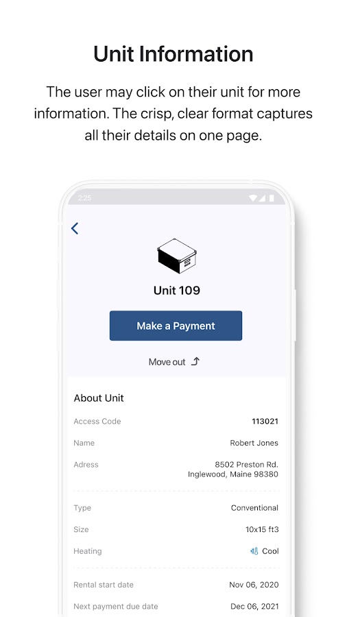 С помощью этого мобильного приложения арендаторы могут въезжать, арендовать несколько квартир и выезжать самостоятельно, используя интеграцию API с программным обеспечением Sitelink. Не нужно звонить в рабочее время, писать электронные письма или отправлять уведомления, когда вы хотите арендовать другую квартиру и/или съехать. Просто запустите процесс въезда/выезда вашей квартиры, следуйте пошаговым инструкциям и будьте уверены, что ваш счет оплачен.