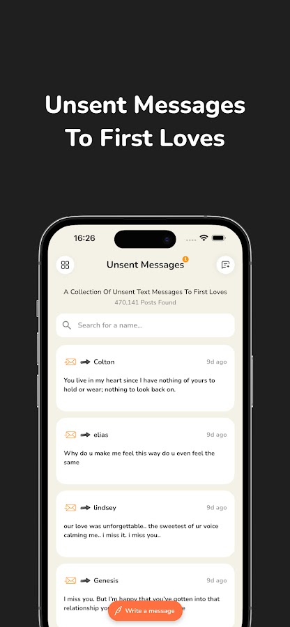 Просматривайте миллионы неотправленных сообщений, чтобы найти анонимные записки, которые могут быть предназначены именно вам. Как и в проекте Unsent, каждое сообщение отражает настоящие эмоции реальных людей, которые писали искренне, но так и не отправили сообщение.