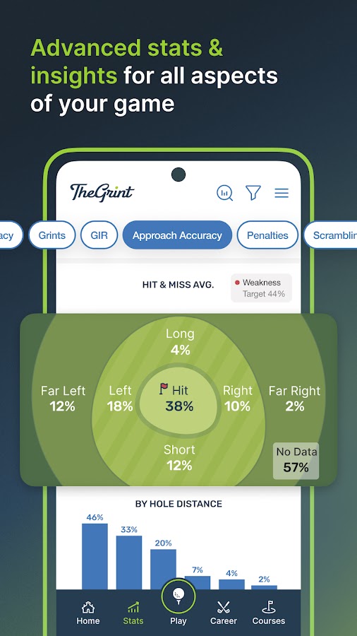 — Отслеживайте более 18 расширенных показателей гольфа, включая FIR, GIR, патты и многое другое.