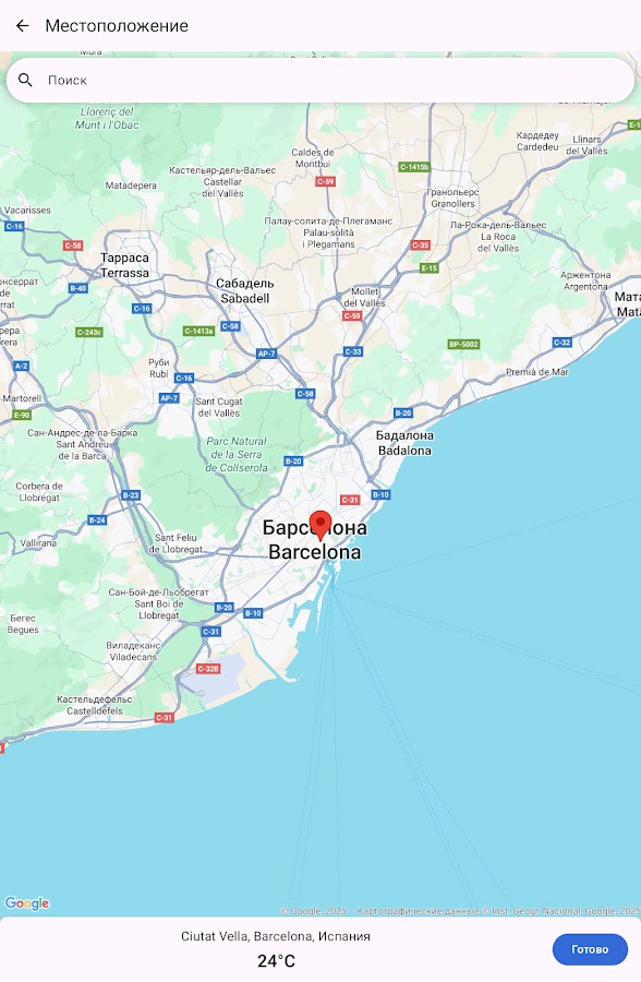 • Гибкая работа с локацией — автоматическое определение местоположения или выбор любой точки на карте, чтобы смотреть условия где угодно. Идеально для поездок и планирования.